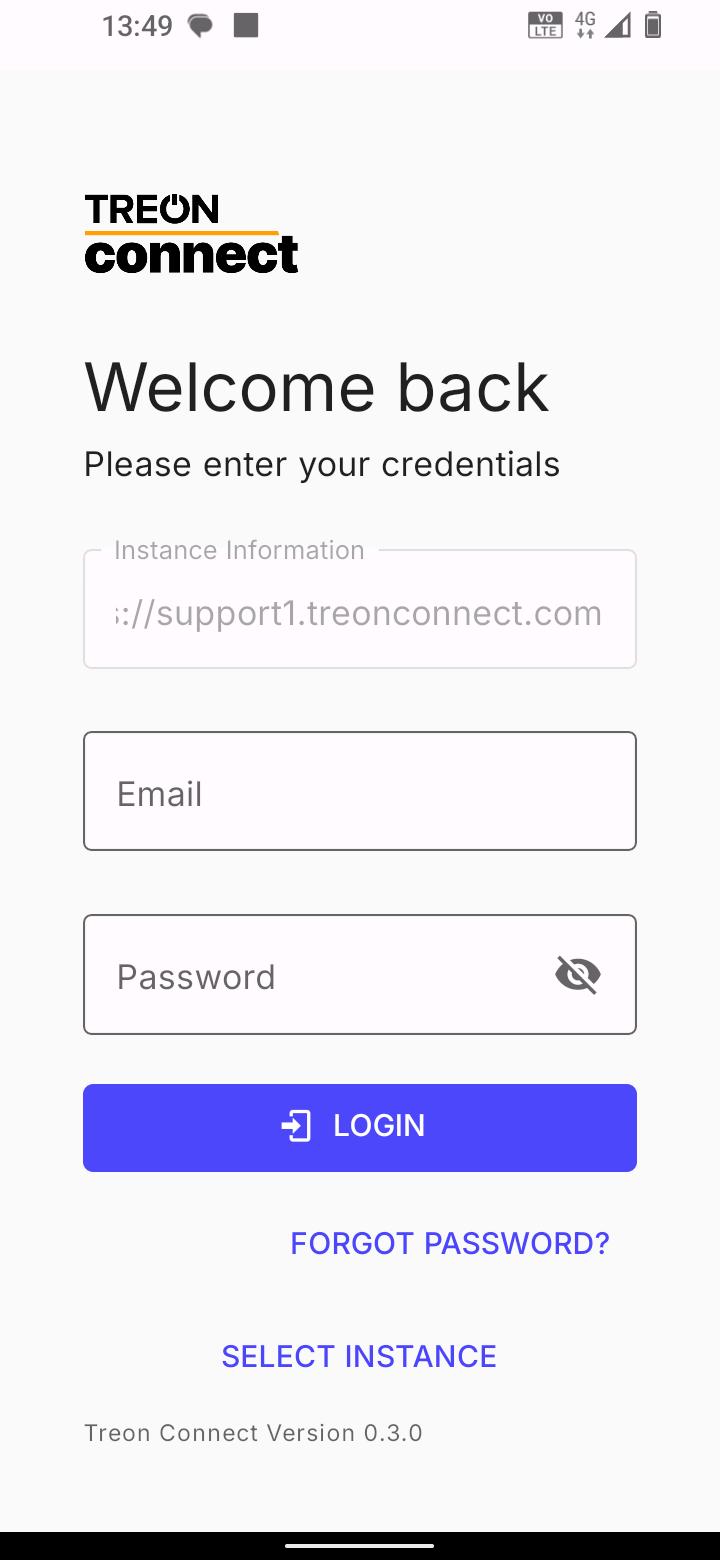 After you have selected your Treon Connect instance, you are asked to enter your email address and your password. Enter both and press LOGIN to log in.