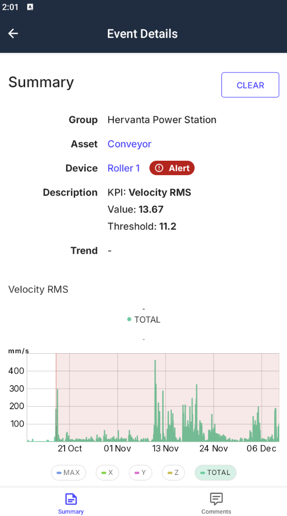 You can now investigate the alert or warning further, check the measurement data and its progression over time. Of course, you can also directly check the Asset on location. You can add comments to the Event, both in Treon Connect Mobile and Treon Connect Web. This way you log all findings for yourself and other staff.