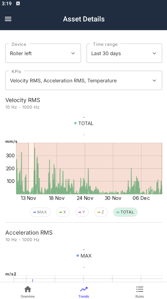 In this example, the measurement value for the KPI Acceleration RMS was 0.54 on 12th February 2025 at 10:30 am.