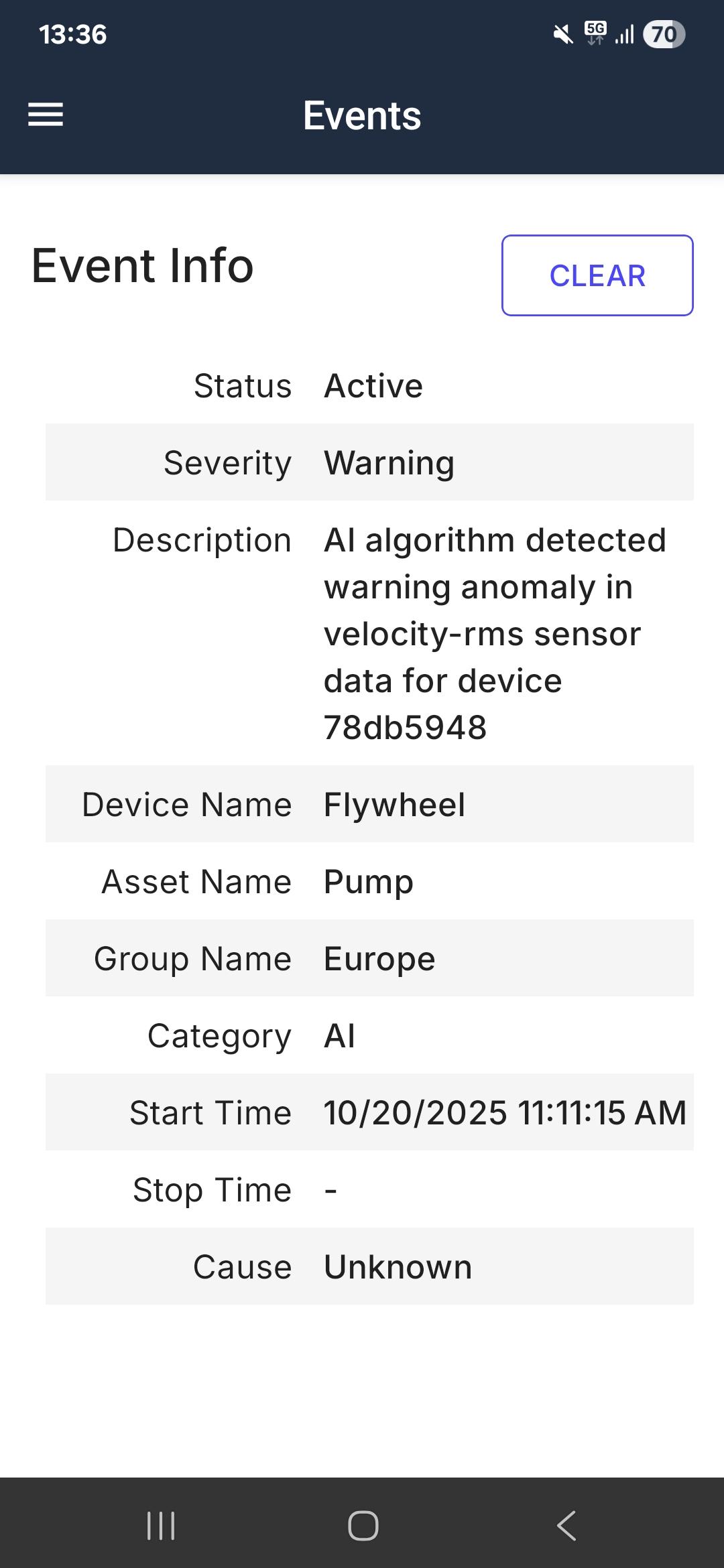 After you have successfully followed your work instructions, you can clear an Event. After clearing, it will no longer show as active in the Events list, but as cleared.