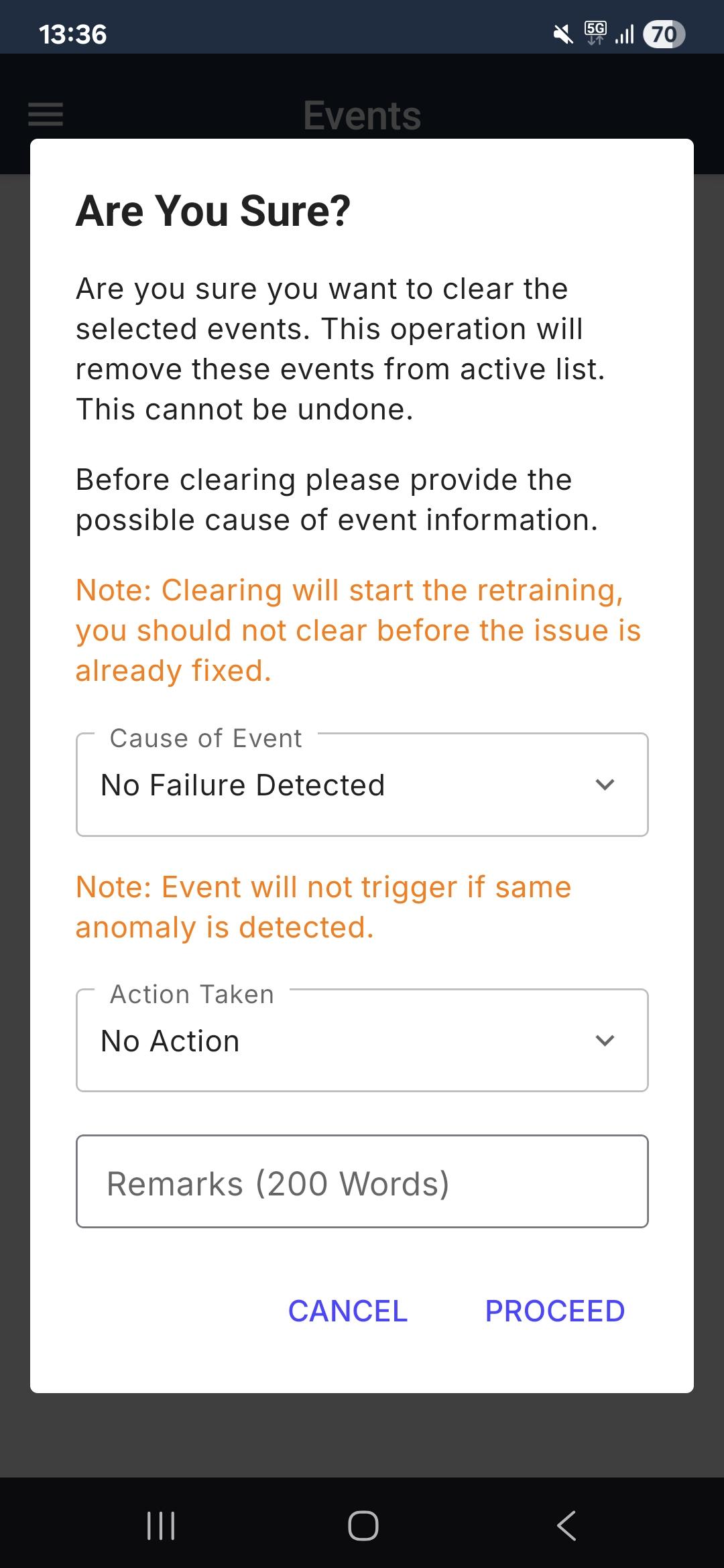 After all data about the event has been filled in, you can confirm clearing the Event by clicking Proceed.