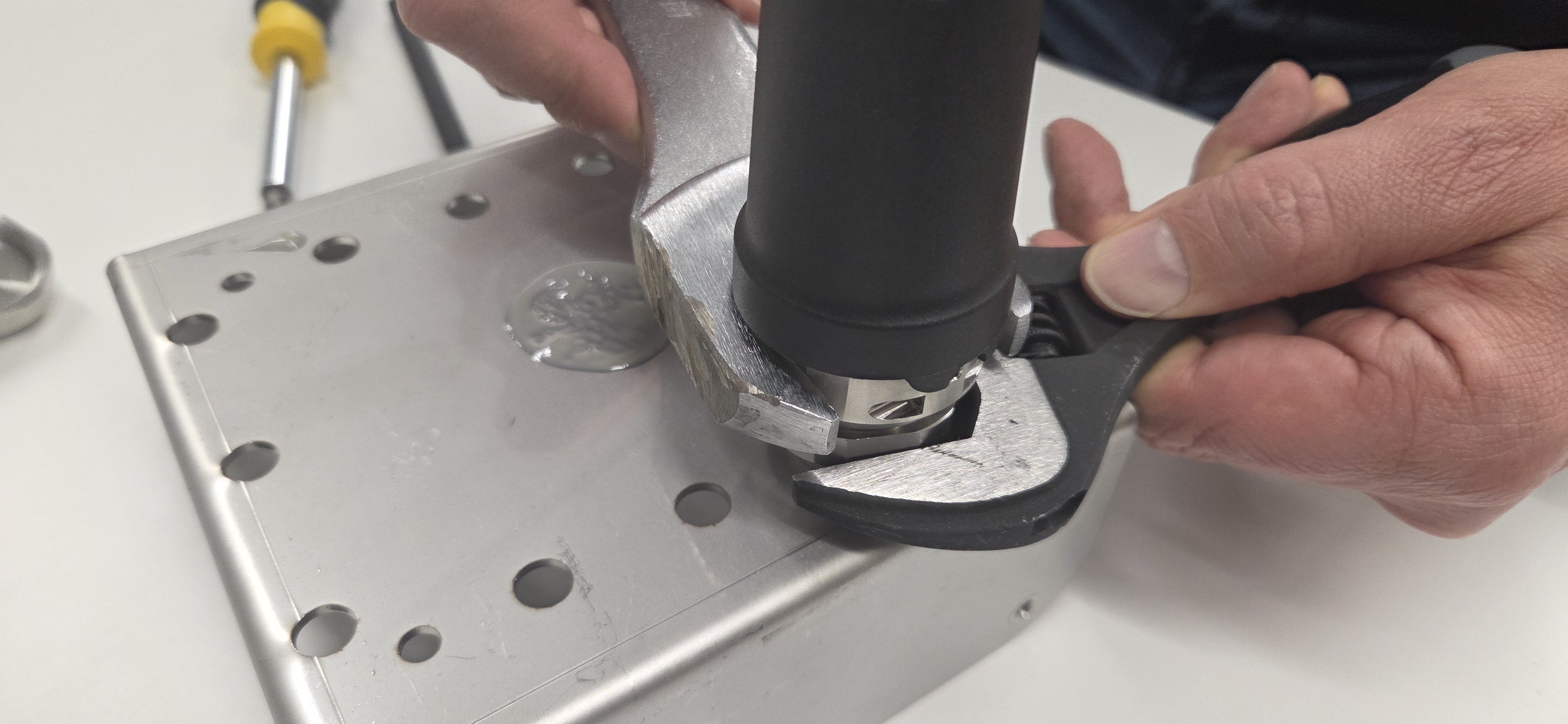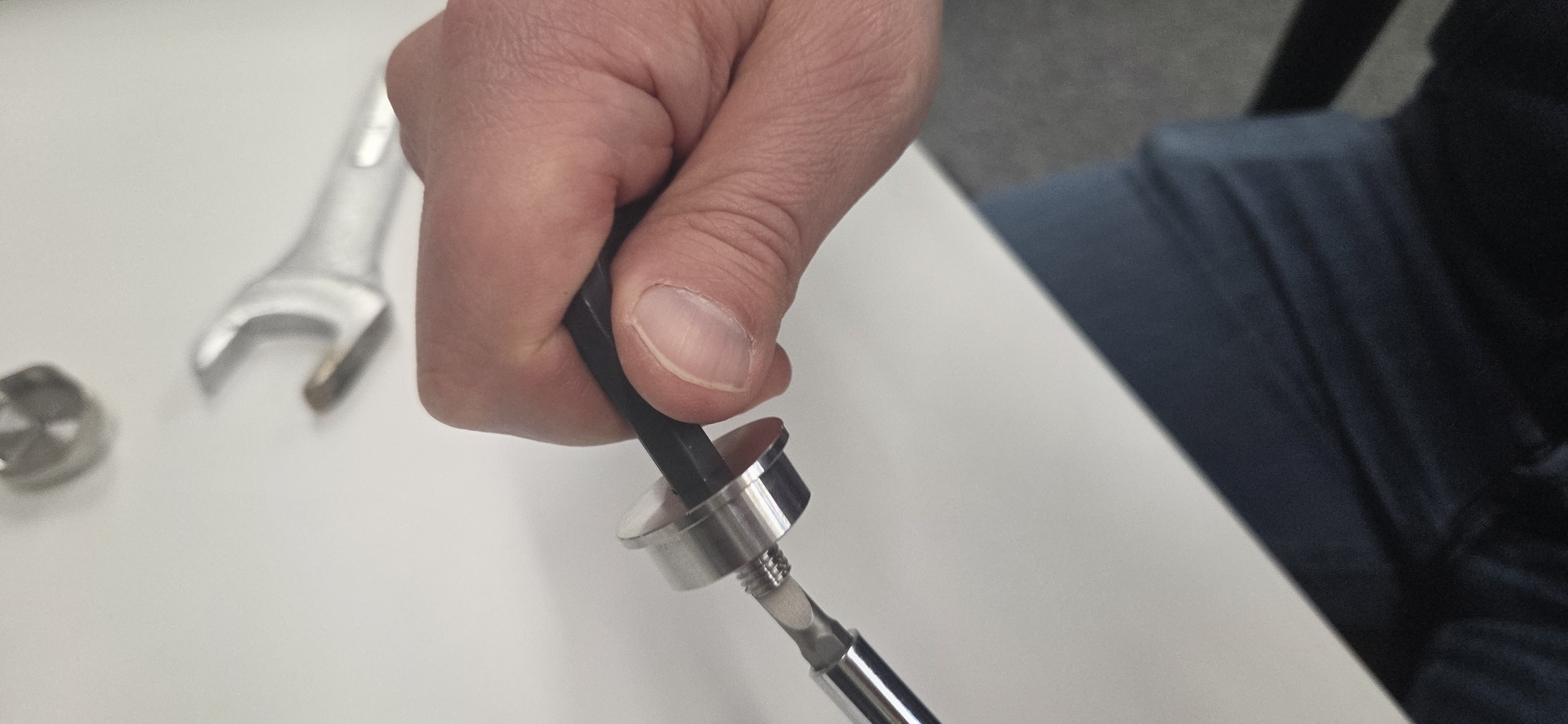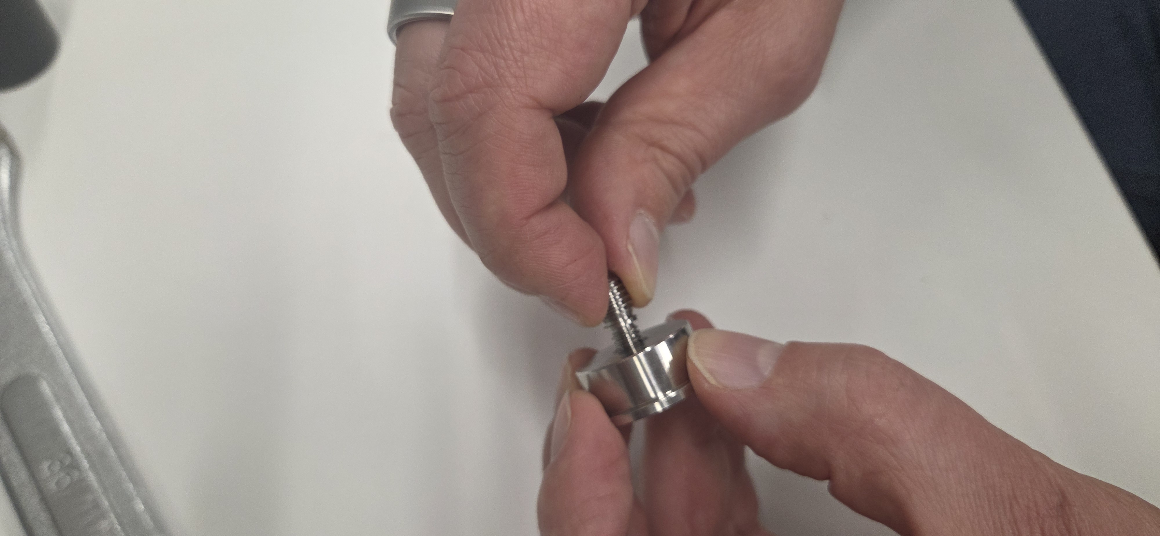Place hex key to hex socket on the top side of the adapter and tighten bolt wit a screwdriver.