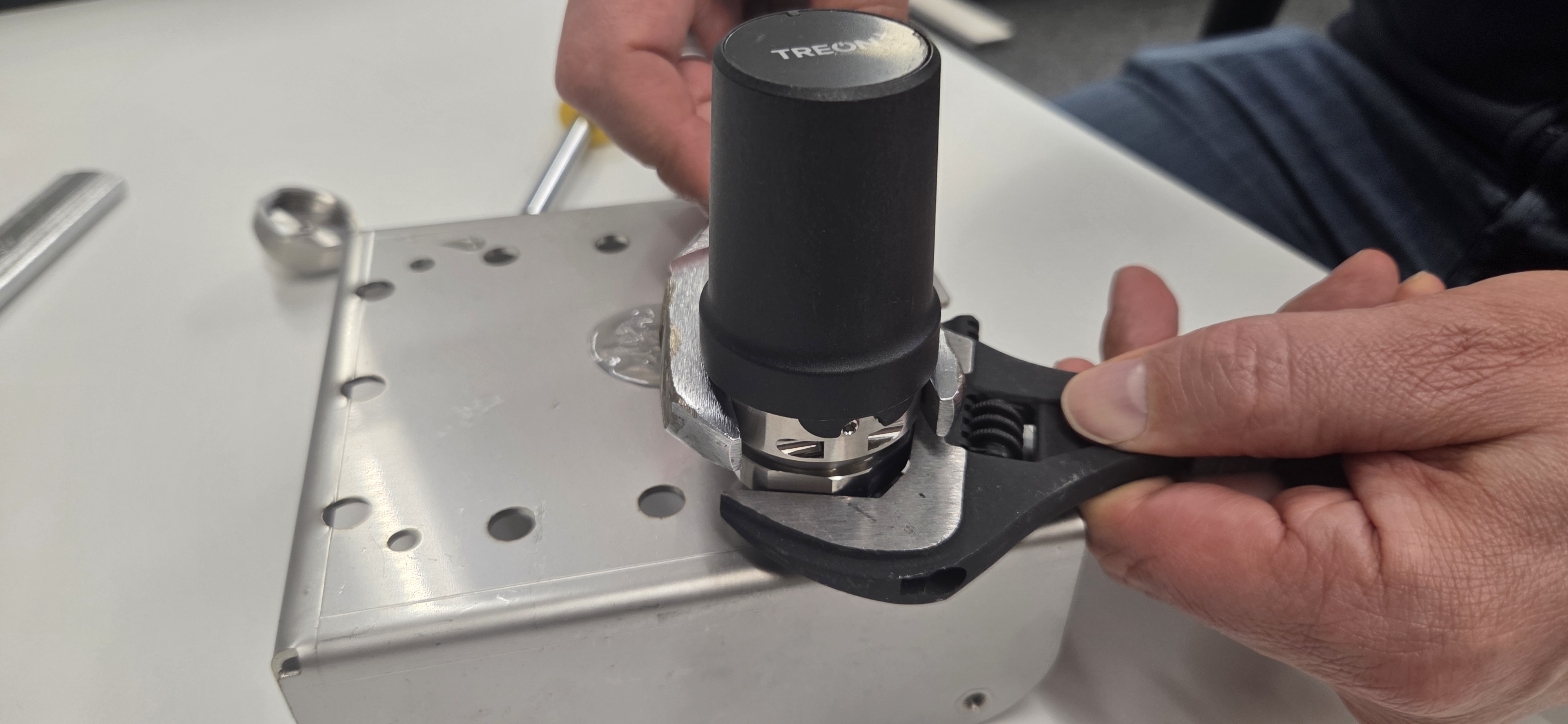 Rotate the node to desired orientation. Tighten the connection with a spanner size 34 mm and a torque wrench set to exactly 20 Nm.