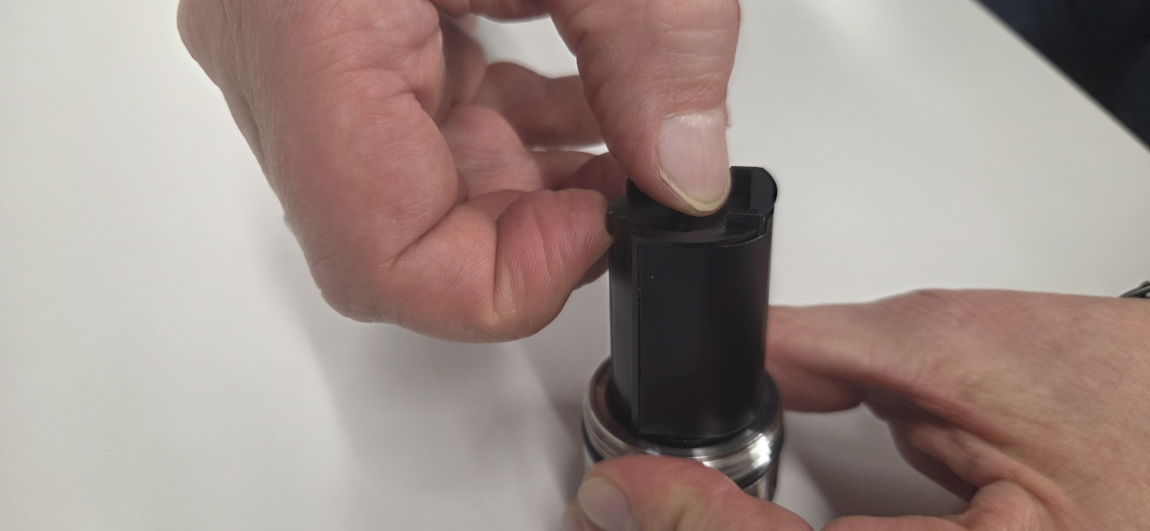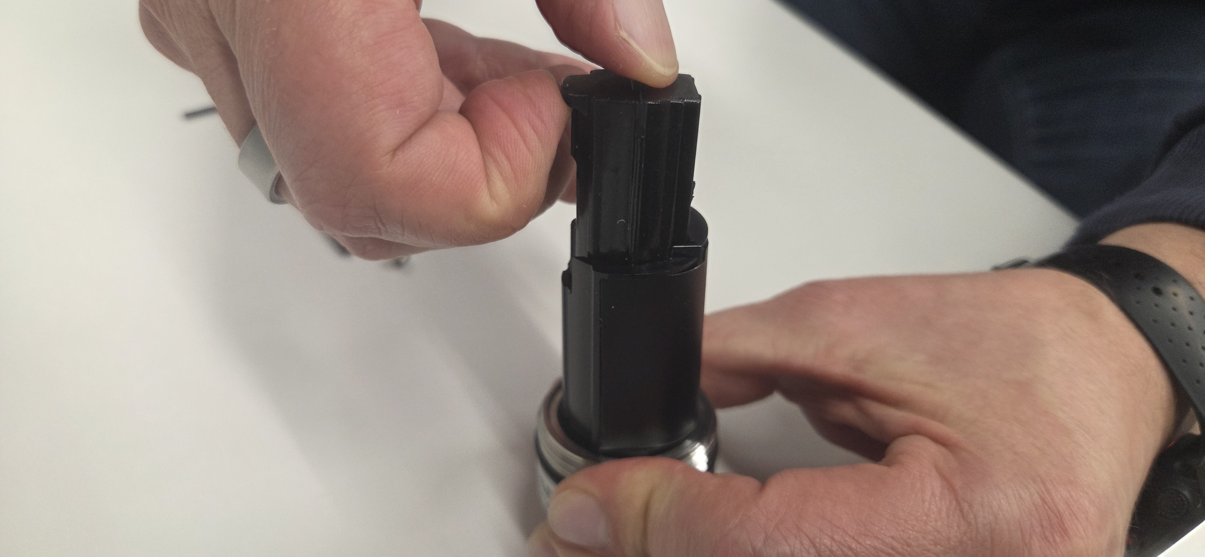 - Close the plastic top cover by turning it clockwise. When fully closed the small notches at the bottom of the top cover will align with the screw opening at the base of the sensor.